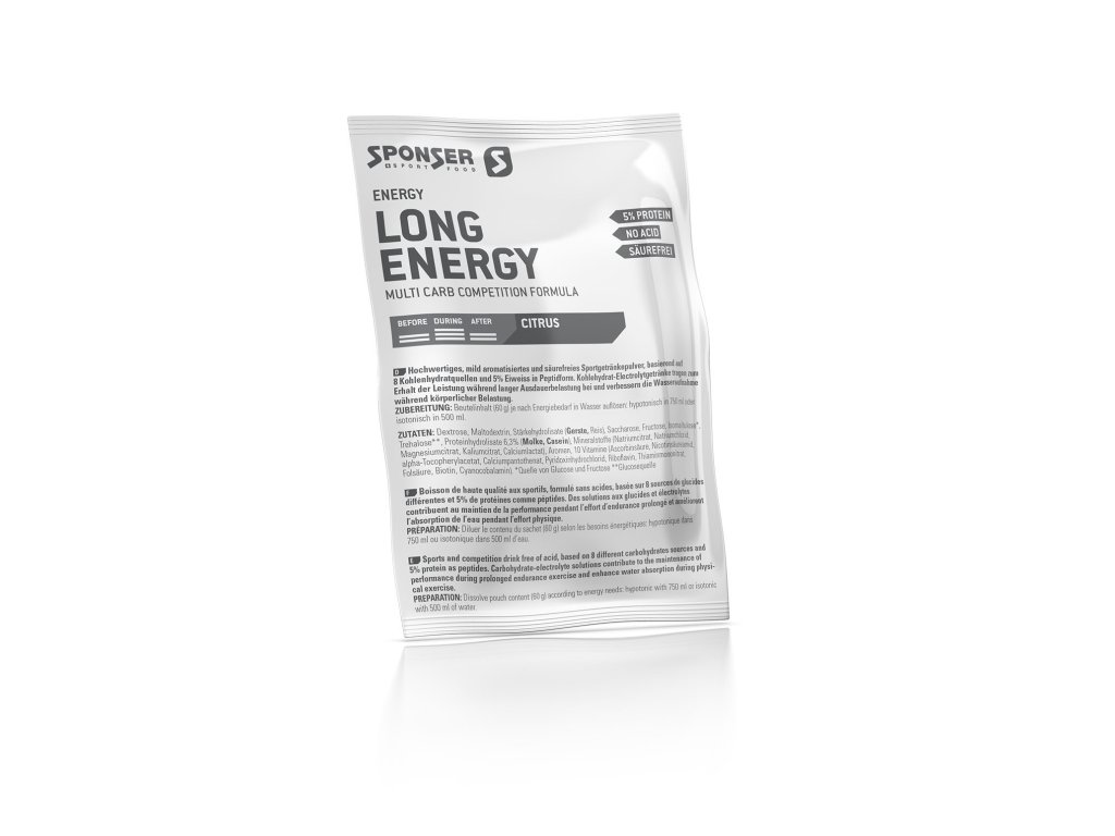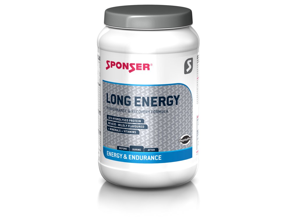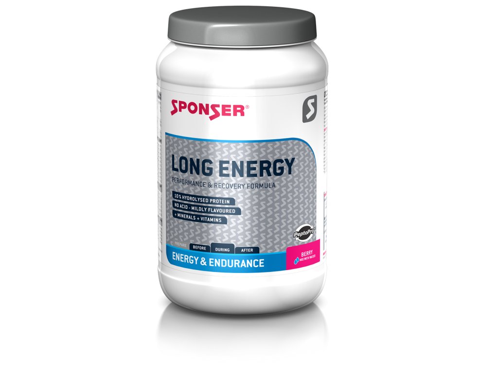 SPONSER LONG ENERGY (s COMPETITION® FORMULA) je vysoce kvalitní hypotonický sportovní nápoj, který je zásaditý, má nízkou osmolalitu a obsahuje 5 % proteinu (10 % proteinu - příchuť Berry) ve formě rychlých peptidů. Hydrolyzát proteinu obsažený v LONG ENERGY zajišťuje rychlejší ukládání glykogenu ve svalech a urychlení regenerace.